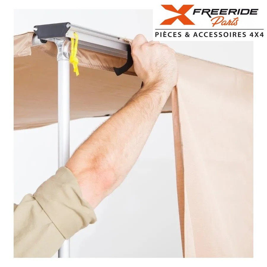 Comprend 2 piquets et 2 cordes et au dessus et sur les côtés velcro pour pouvoir fixer sur l'auvent.