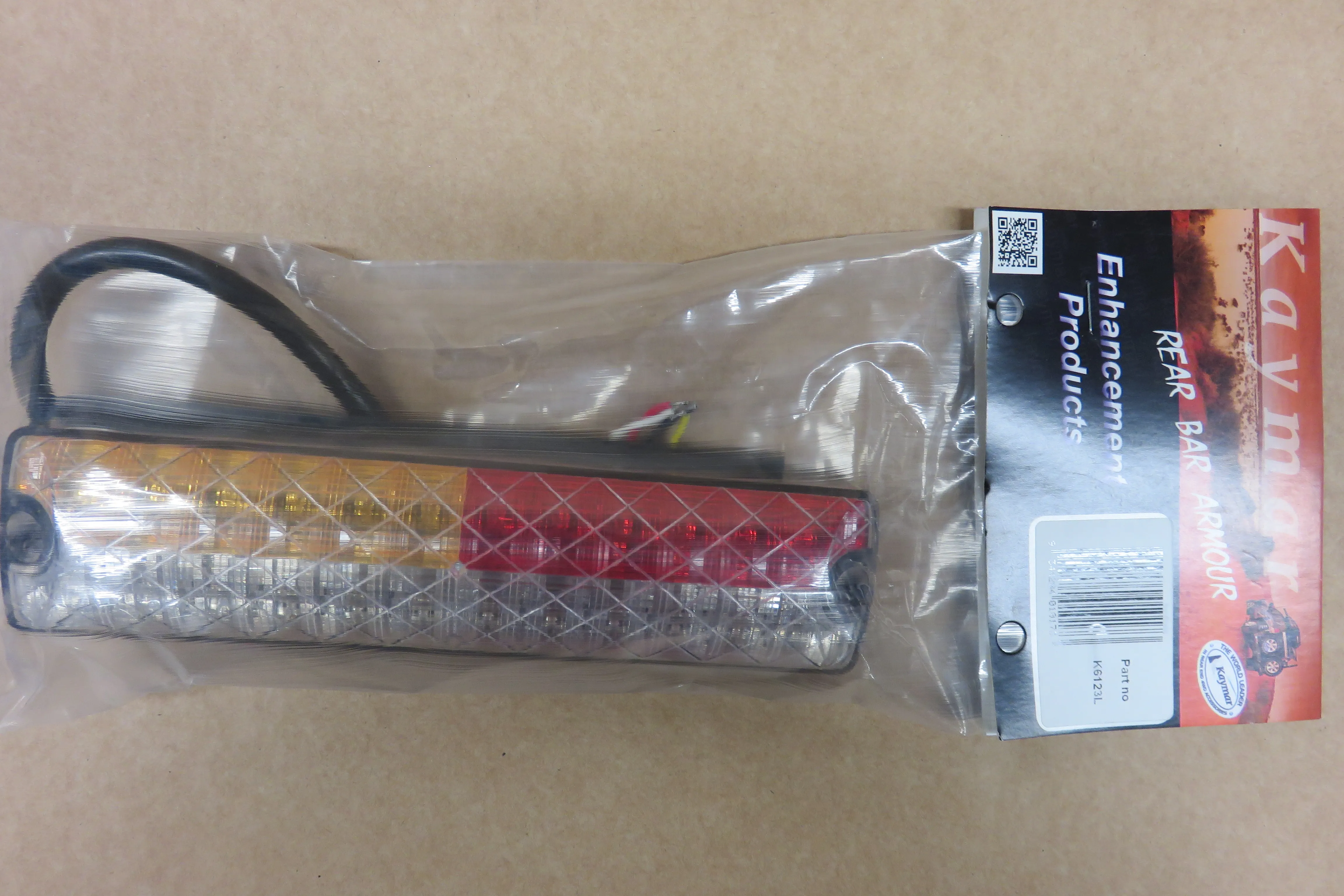Feu arrière à Led pour pare chocs arrière Kaymar. Montage avec clignotant côté gauche en haut Modèle avec le feu de recul en bas qui parcourt toute la largeur