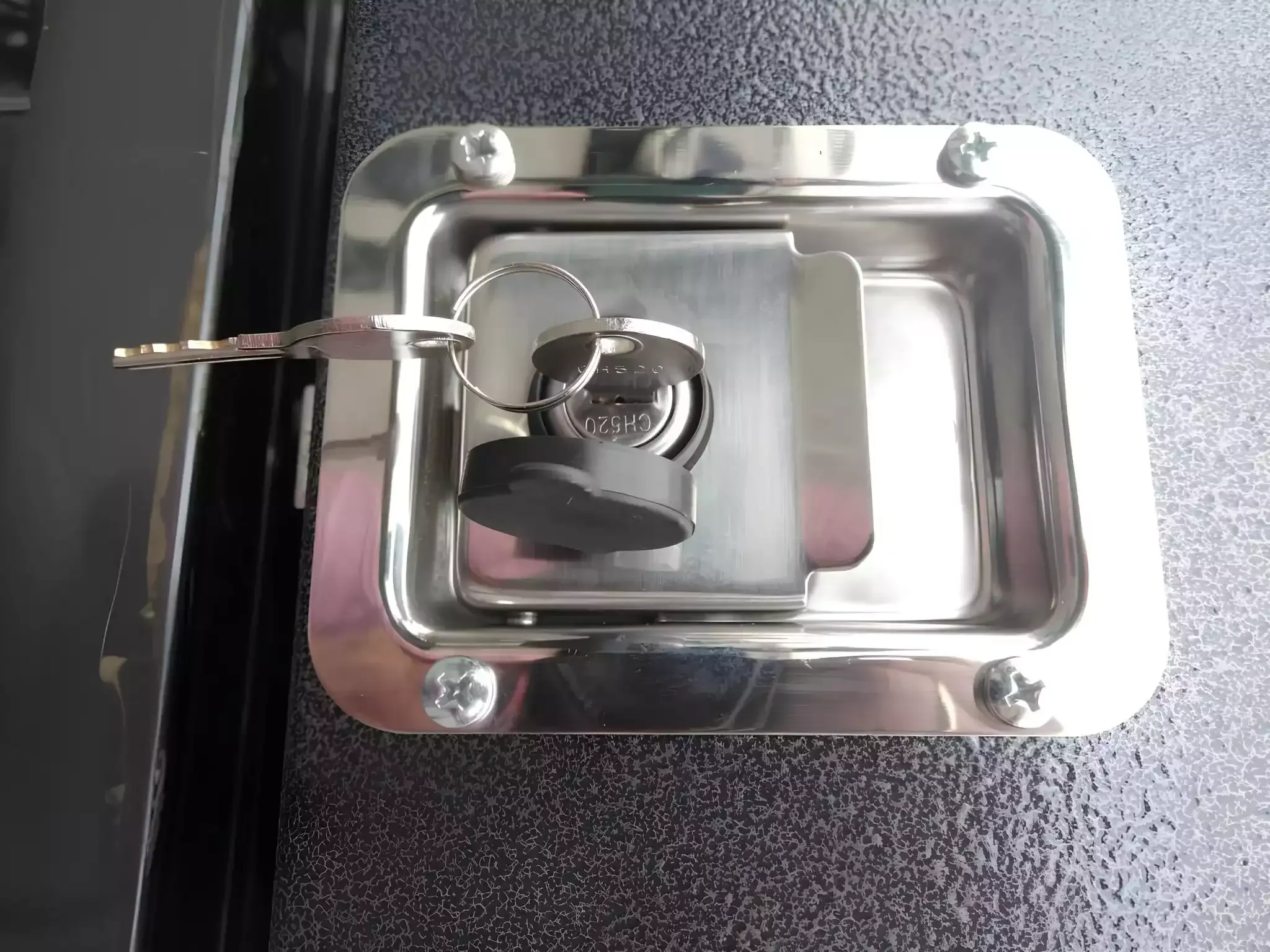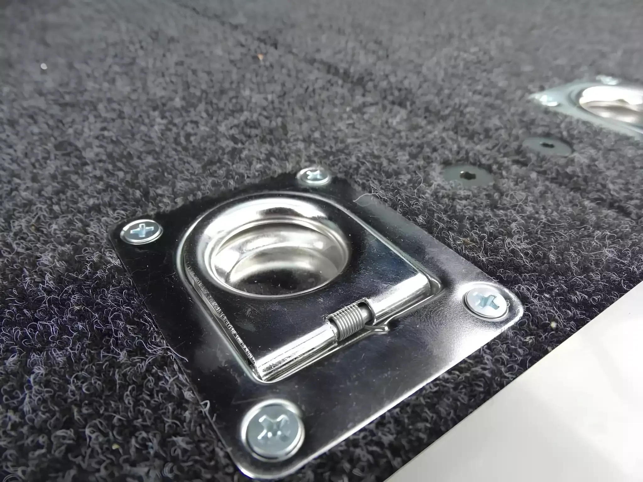 Les façades sont thermolaquées en argent antique, ce qui ajoute de l'esthétique à l'ensemble. Le tiroir est équipé d'une solide serrure en acier inoxydable qui peut être verrouillée avec une clé. La partie supérieure est en contreplaqué recouvert de feutre, fixée sur les bords par un coin en aluminium, ce qui permet à l'ensemble de bien s'adapter à l'intérieur de la voiture et d'être agréable à utiliser.