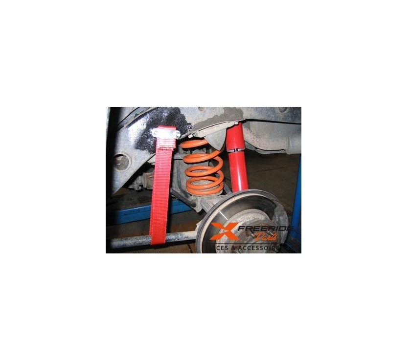 Le kit sangle anti débattement est prévu pour un essieu. Il comprend 2 sangles plus 4 supports à souder sur le chassis et l'essieu ou triangle, dans certain cas seulement 2 supports sont nécessaire car on peut faire le tour du tirant de pont avec la sangle. Le montage est entièrement réglable pour pouvoir s'adapter à tous types de longueur d'amortisseurs