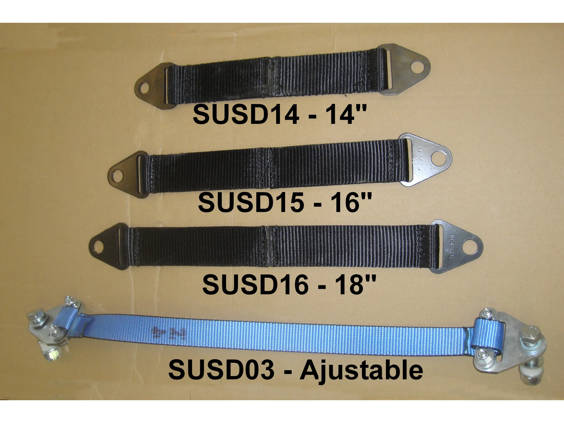 Kit universel réglable Pour ceux qui ne veulent pas souder ou qui veulent un système démontable. Ce kit de sangles anti-débattements avec son système de réglage exclusif lui permettra de s'adapter à tous les types de suspension. Le montage peut être réalisé en sangle simple ou double brin. Longeur de la sangle : 340mm Axe: 16