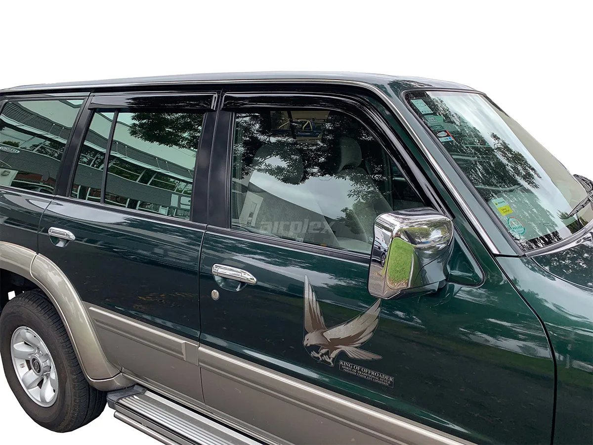 Montage collé - Version Patrol châssis long Ces déflecteurs permettent de rouler les vitres entrouvertes sans subir les effets du vent, de la pluie ou de projections.Idéals pour les escapades en pleine nature, ils assurent une meilleure ventilation de l'habitacle tout en réduisant le bruit aérodynamique.Ils sont conçus pour s'intégrer simplement sur les vitres avant gauche et droite, ainsi que les vitres arrières du véhicule. Livrés en 4 pièces, ils sont fabriqués en acrylique teinté de haute qualité et sont stabilisés contre les rayons UV. Leur système de montage collé par adhésif double face garantit une installation rapide, sans perçage ni outil spécifique, et un maintien fiable dans le temps. Ils offrent une excellente durabilité face aux intempéries et aux conditions extrêmes.Caractéristiques :- Marque : Airplex (Made in New Zealand)- Montage : Fixation collée, adhésif double face 3M (sans perçage)- Emplacement : Vitres avant (conducteur et passager) et arrière- Matériau : Acrylique teinté foncé, haute résistance, stabilisé UV- Finition : Teinte sombre, design Slim, profil affiné et discret- Conditionnement : Jeu de 4 pièces- Usage : Ventilation optimisée, réduction du bruit aérodynamique, confort de conduite amélioré par tous les temps