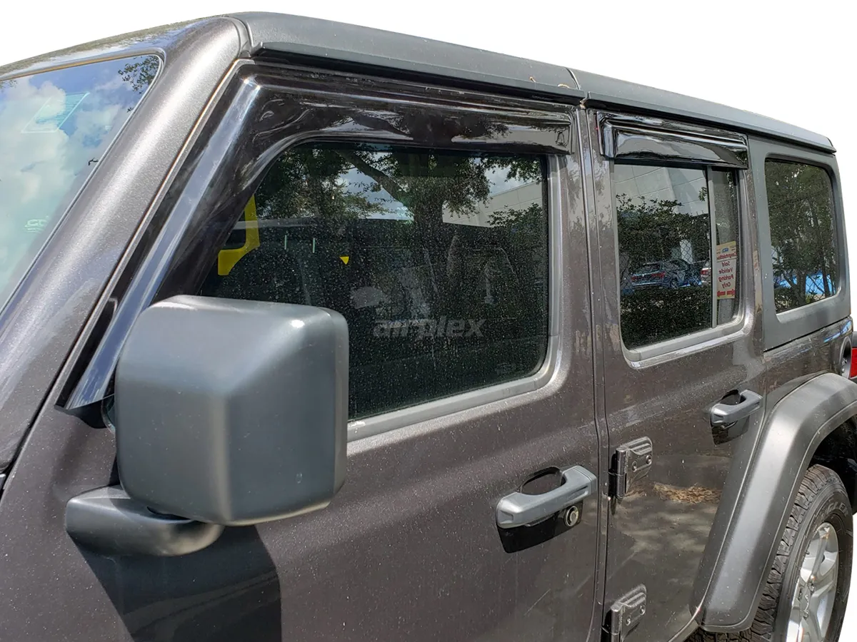Montage collé - Version pour Wrangler 4 portes Ces déflecteurs permettent de rouler les vitres entrouvertes sans subir les effets du vent, de la pluie ou de projections.Idéals pour les escapades en pleine nature, ils assurent une meilleure ventilation de l'habitacle tout en réduisant le bruit aérodynamique.Ils sont conçus pour s'intégrer simplement sur les vitres avant gauche et droite, ainsi que les vitres arrières du véhicule. Livrés en 4 pièces, ils sont fabriqués en acrylique teinté de haute qualité et sont stabilisés contre les rayons UV. Leur système de montage collé par adhésif double face garantit une installation rapide, sans perçage ni outil spécifique, et un maintien fiable dans le temps. Ils offrent une excellente durabilité face aux intempéries et aux conditions extrêmes.Caractéristiques :- Marque : Airplex (Made in New Zealand)- Montage : Fixation collée, adhésif double face 3M (sans perçage)- Emplacement : Vitres avant (conducteur et passager) et arrière- Matériau : Acrylique teinté foncé, haute résistance, stabilisé UV- Finition : Teinte sombre, design Slim, profil affiné et discret- Conditionnement : Jeu de 4 pièces- Usage : Ventilation optimisée, réduction du bruit aérodynamique, confort de conduite amélioré par tous les temps