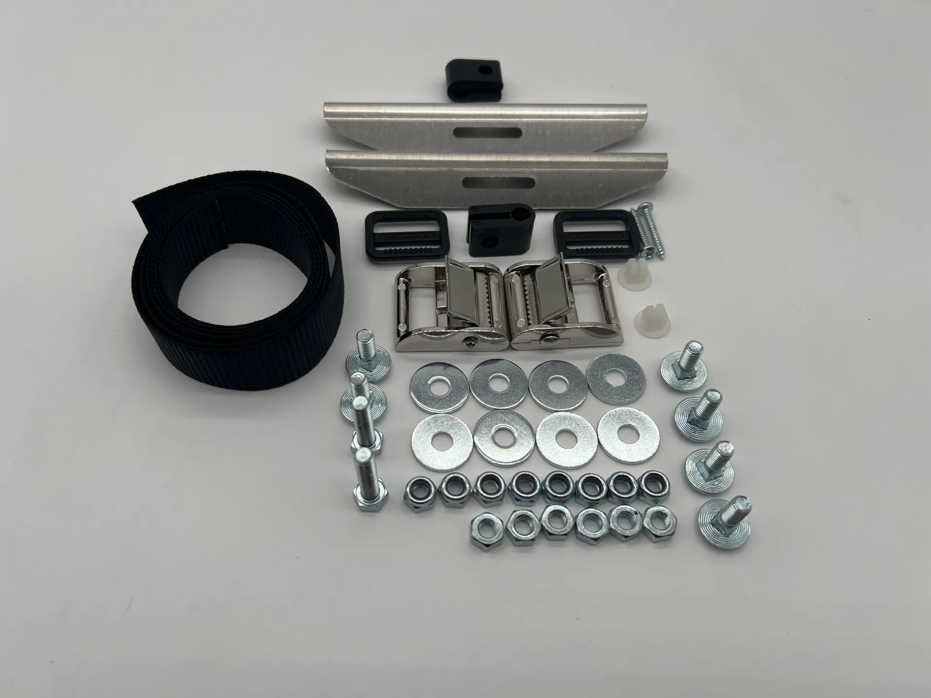 La paire Kit de sangles grises permettant de relever à volonté les bavettes de votre véhicule. Kit complet pour une paire de bavette : Cames à griffe Sangle Équerres de renfort Visserie Notice