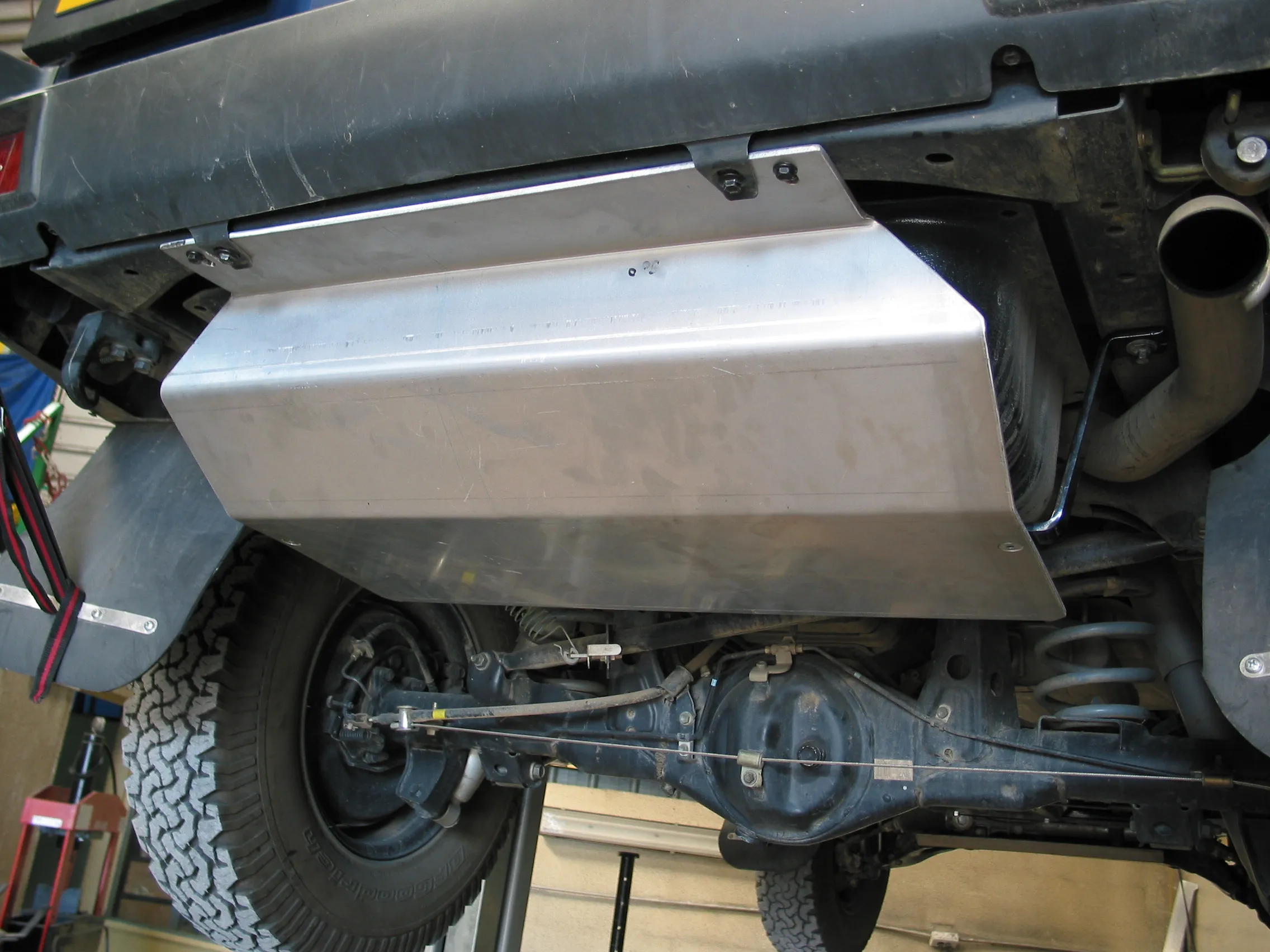 Blindage de réservoir en aluminium de 6mm - réservoir d'origine Compatible avec les véhicules : Toyota Land Cruiser KZJ95 KDJ95 Pour châssis long 5 portes. Vis affleurantes. Montage sans modification du véhicule. Kit complet comprenant : Tôle de protection Nécessaire de montage Visserie Notice