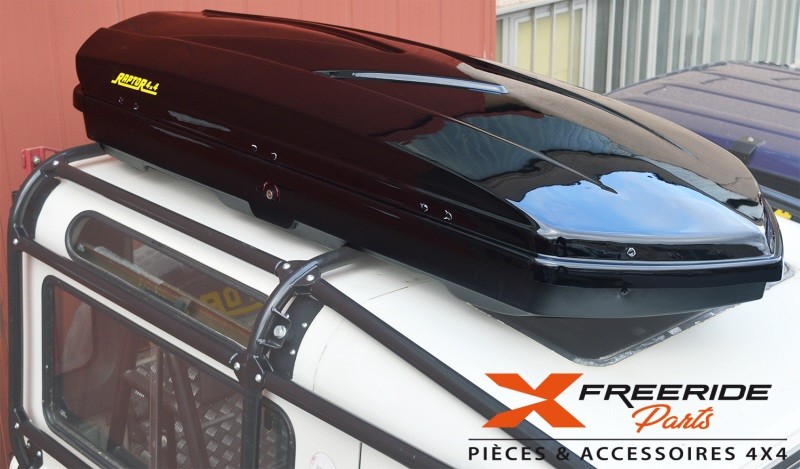 Ouverture des deux côtés, double clé, guides de fixation sur barres de toit ou galerie de toit. Embase noire épaisseur 4mm