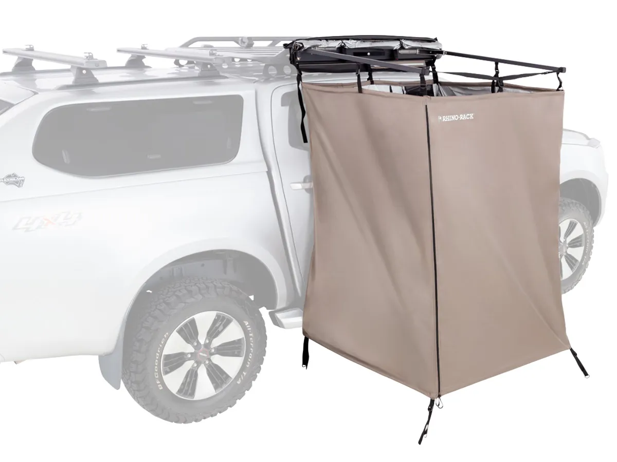 Fixation sur galerie ou barre de toit. La cabine de douche Rhino-Rack est une solution pratique, compacte et fonctionnelle pour tous les adeptes de la vie en plein air. Conçue pour s'installer facilement sur le flanc d'un véhicule équipé de barres ou d'une plateforme compatible Rhino-Rack, cette tente offre un espace intime et protégé, idéal pour la toilette, le changement de vêtements ou l'installation d'un WC de bivouac, en pleine nature comme sur chantier.Une fois repliée, elle ne mesure que 1,1 mètre de long, se fondant discrètement dans la ligne du véhicule. À l'ouverture, elle s'étend sur 1 mètre de large, créant un espace fonctionnel parfaitement isolé. Grâce à sa structure autoportante légère renforcée par des parois lestées, la cabine assure une bonne tenue au vent et une stabilité immédiate, sans nécessité de haubans complexes. Elle est confectionnée en polyester 300D avec un revêtement intérieur argenté, assurant une protection visuelle optimale, même en pleine lumière. Le toit est repliable pour une ventilation naturelle ou une douche solaire, tandis que l'intérieur est équipé de poches de rangement, d'un porte-serviette et d'une conception pensée pour l'usage quotidien en itinérance.Livrée avec supports de fixation, piquets et housse de transport résistante, cette cabine est prête à être montée sur n'importe quel aménagement offroad ou van aménagé. Elle s'intègre parfaitement dans l'écosystème Rhino-Rack et complète avec efficacité tout kit de vie nomade.Caractéristiques :- Type de produit : tente de douche / cabine latérale autoportante- Dimensions replié : 1,1 m- Dimensions déployé : 1 m de profondeur- Poids : 6,7 kg (hors supports)- Tissu : polyester 300D avec revêtement argenté intérieur pour la confidentialité- Structure : cadre rigide avec parois lestées – autoportant- Fonctionnalités : toit repliable, poches de rangement, porte-serviette- Protection : tissu imperméable, résistant aux UV et à la déchirure- Accessoires inclus : supports de montage, piquets, housse de transport- Fixation : compatible avec barres Rhino-Rack et plateformes Pioneer