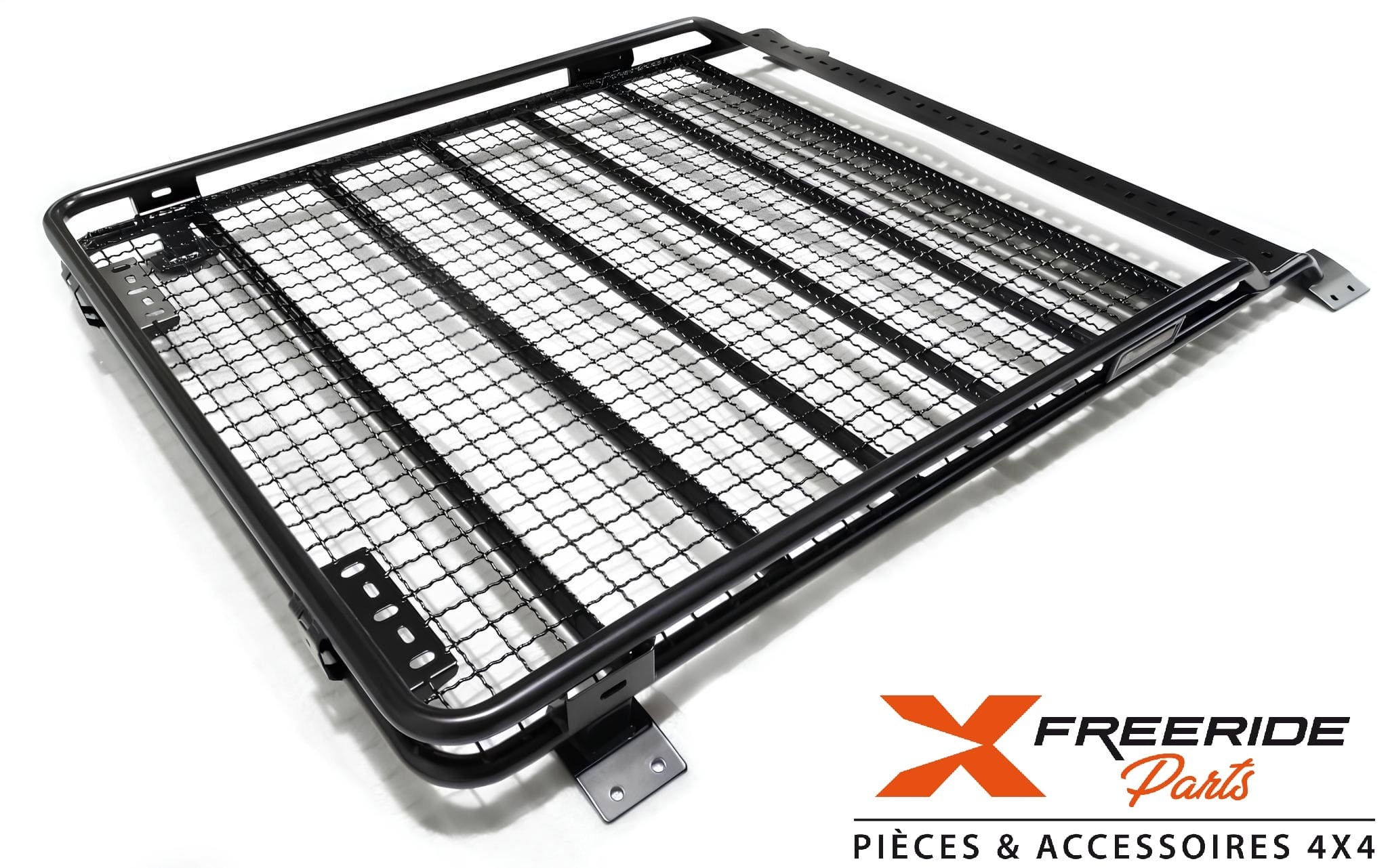 Nous vous présentons cette galerie de toit F4X4 conçue pour votre Jimny. Ce modèle est disponible avec ou sans grille métallique maillée, selon votre préférence.