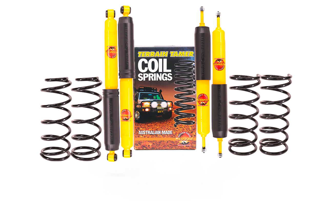 Kit réhausse +5 cm Terrain Tamer pour Nissan Patrol GR Y61 Composition du kit : - 4 amortisseurs - 4 ressorts Depuis 1969, Terrain Tamer développe en Australie des kits de suspension et de réhausse 4x4 et pickup conçus pour les conditions extrêmes, le tout-terrain, les raids longue distance et un usage mixte route / off-road. Spécialement étudiés pour les véhicules tout-terrain et pickups chargés, les kits réhausse Terrain Tamer corrigent les limites des suspensions d’origine en améliorant la garde au sol, la motricité, la stabilité et le contrôle du châssis, même avec équipements lourds ou en franchissement. La suspension repose sur des composants hautes performances : - Ressorts progressifs à pas variable - Amortisseurs gaz haute capacité, tarés pour l’off-road et les raids longue distance Ces éléments permettent une capacité de charge optimisée, un meilleur débattement et une tenue de route sécurisée, aussi bien sur piste, sable, boue, roche que sur route. Les kits suspension Terrain Tamer sont livrés clé en main : ressorts, amortisseurs, lames, kit de montage complet (silent-blocs, brides, axes, jumelles graissables) et amortisseur de direction selon compatibilité véhicule. Le tarage avant et arrière est personnalisable sans surcoût, afin d’adapter précisément la suspension à votre type de conduite, charge et préparation 4x4. Kit suspension 4x4 & Pickup Terrain Tamer - Off-Road, Raid, Route & Charge lourde