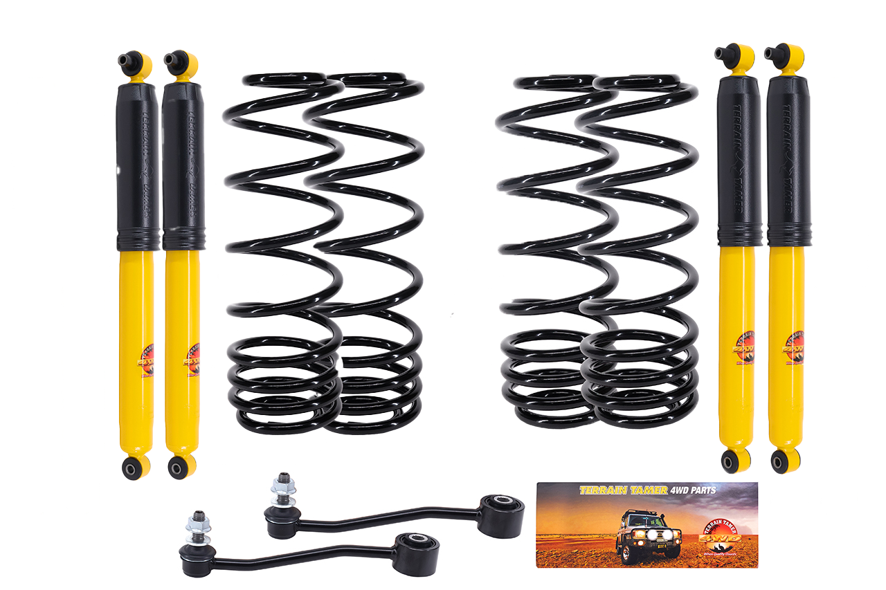 Kit réhausse +5 cm Terrain Tamer pour Jeep Wrangler JL Composition du kit : - 4 amortisseurs - 4 ressorts - 2 biellettes de barre stab rallongées Depuis 1969, Terrain Tamer développe en Australie des kits de suspension et de réhausse 4x4 et pickup conçus pour les conditions extrêmes, le tout-terrain, les raids longue distance et un usage mixte route / off-road. Spécialement étudiés pour les véhicules tout-terrain et pickups chargés, les kits réhausse Terrain Tamer corrigent les limites des suspensions d’origine en améliorant la garde au sol, la motricité, la stabilité et le contrôle du châssis, même avec équipements lourds ou en franchissement. La suspension repose sur des composants hautes performances : - Ressorts progressifs à pas variable - Amortisseurs gaz haute capacité, tarés pour l’off-road et les raids longue distance Ces éléments permettent une capacité de charge optimisée, un meilleur débattement et une tenue de route sécurisée, aussi bien sur piste, sable, boue, roche que sur route. Les kits suspension Terrain Tamer sont livrés clé en main : ressorts, amortisseurs, lames, kit de montage complet (silent-blocs, brides, axes, jumelles graissables) et amortisseur de direction selon compatibilité véhicule. Le tarage avant et arrière est personnalisable sans surcoût, afin d’adapter précisément la suspension à votre type de conduite, charge et préparation 4x4. Kit suspension 4x4 & Pickup Terrain Tamer - Off-Road, Raid, Route & Charge lourde