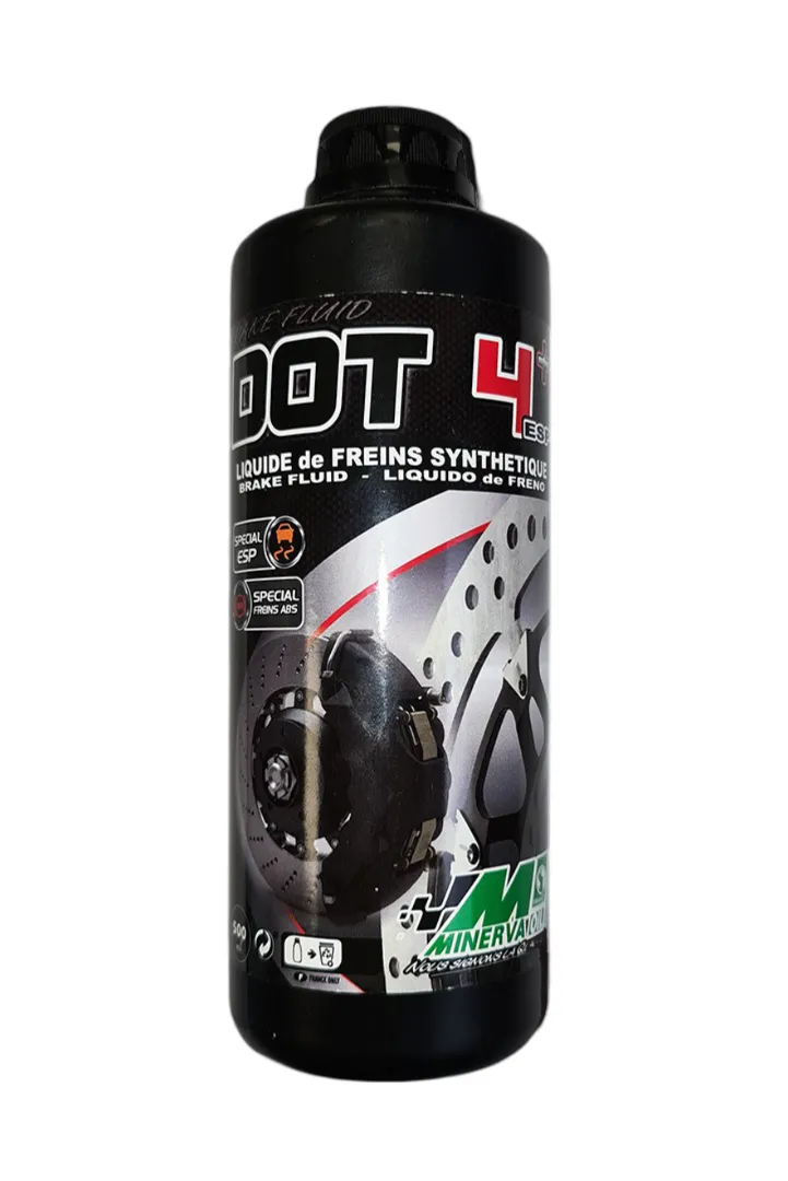 Le liquide de frein Minerva DOT 4+ est un liquide à faible viscosité 100% synthétique pour freins à disque ou à tambours et embrayages hydrauliques.