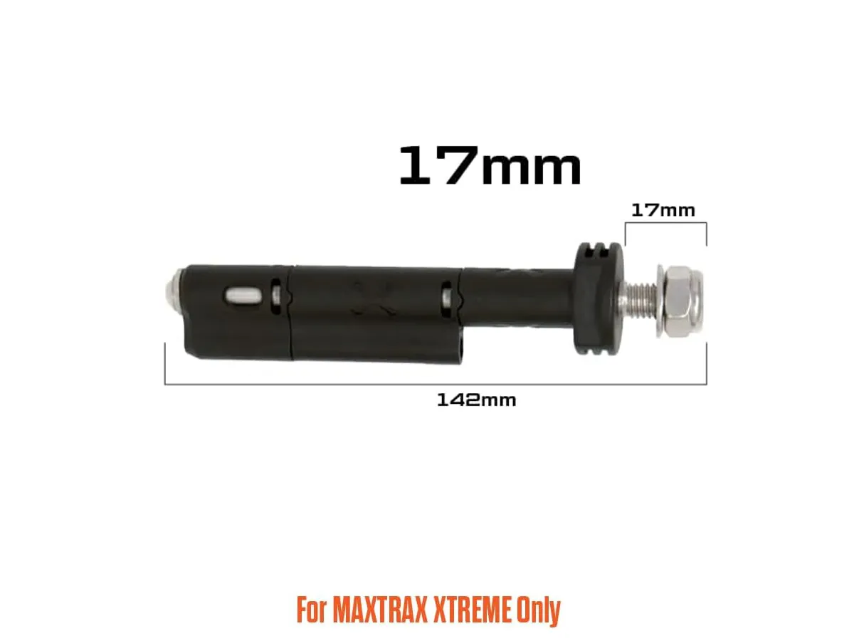 Compatibles Maxtrax Xtreme uniquement Les fixations rapides Maxtrax Xtreme 17mm sont spécialement conçues pour sécuriser 2 ou 4 plaques de désensablage Maxtrax Xtreme sur votre plateforme de toit ou barres transversales. Fabriqués en nylon renforcé à la fibre de verre et en acier inoxydable, ces axes assurent une fixation résistante et durable, adaptée aux environnements off-road les plus exigeants.Avec un filetage M10 de 17mm, ces fixations sont idéales pour les configurations nécessitant des axes plus courts, notamment pour le Maxtrax Flat Rack Mount. Leur conception inclut un trou intégré en haut de chaque axe permettant l'ajout d'un petit cadenas pour sécuriser vos plaques contre le vol.Caractéristiques :Dimensions :- Longueur totale : 165 mm, incluant 17 mm de filetage (diamètre M10)- Filetage court pour applications spécifiquesPoids : 100 g par axeMatériaux :- Corps en nylon renforcé à la fibre de verre pour une résistance accrue- Visserie en acier inoxydable pour une durabilité et une protection contre la corrosionCompatibilité : - Spécifique aux plaques Maxtrax Xtreme (non incluses)- Idéal pour les supports nécessitant un filetage court, notamment le Maxtrax Flat Rack MountContenu du kit :- 4 axes de fixation rapides pour 2 ou 4 plaques Maxtrax Xtreme - 4 écrous Nyloc en acier inoxydable pour un maintien sécurisé- 4 rondelles plates en acier inoxydable pour une fixation stable et fiable