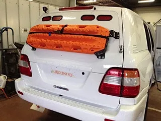 Pour 2 à 4 plaques Ce kit permet de transporter facilement une ou deux paires de plaque de désensablage Maxtrax sur le hayon de votre 4x4 Grace à cette installation les plaques sont d'un accès très facile et rapide Forme spécifique pour accueillir les plaques de marque Maxtrax Le maintient des plaques est assuré par une sangle à cliquets et des vérins de hayon renforcés permettent l'ouverture du hayon malgré le supplément de poids Le montage nécessite le perçage du hayon et le démontage du balai d'essuie-glace arrière
