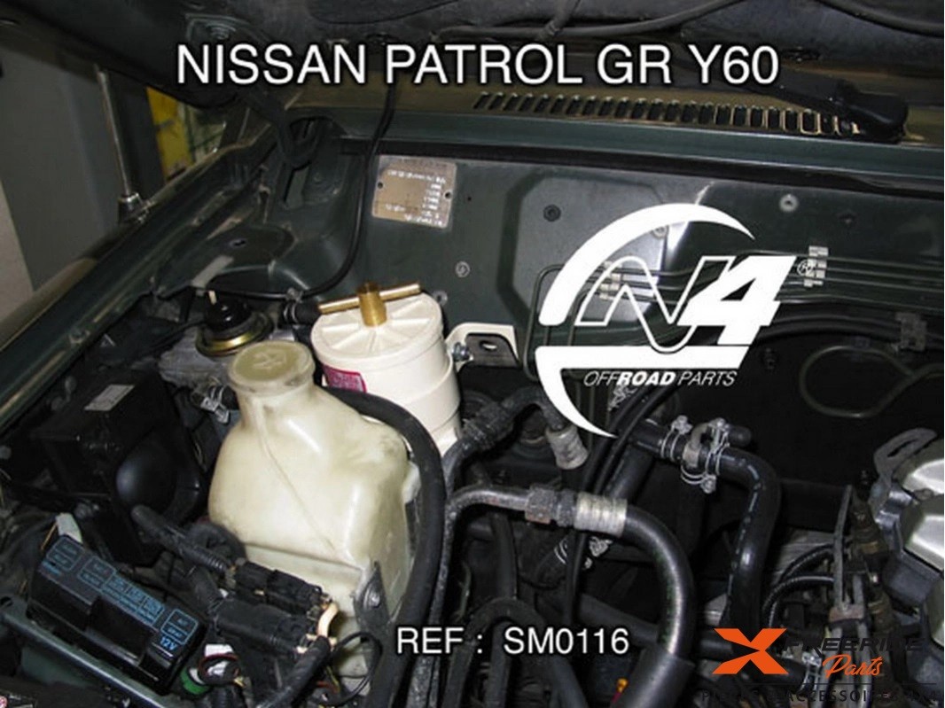 Support pour le montage d'un préfiltre à Gasoil Racor série 500FG pour Nissan Patrol Y60 N4-Offroad Perçage nécessaire. Kit complet comprenant: Support Raccords Collier Durite Nécessaire de montage Visserie Notice Le préfiltre RACOR série 500FG est vendu séparément référence : SCMO04