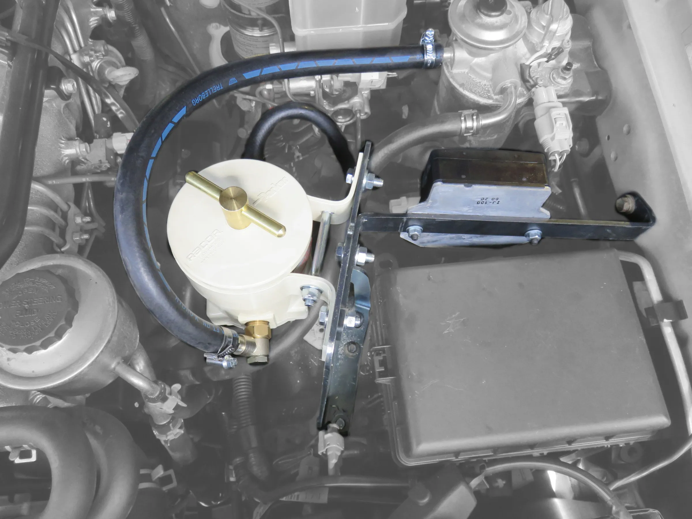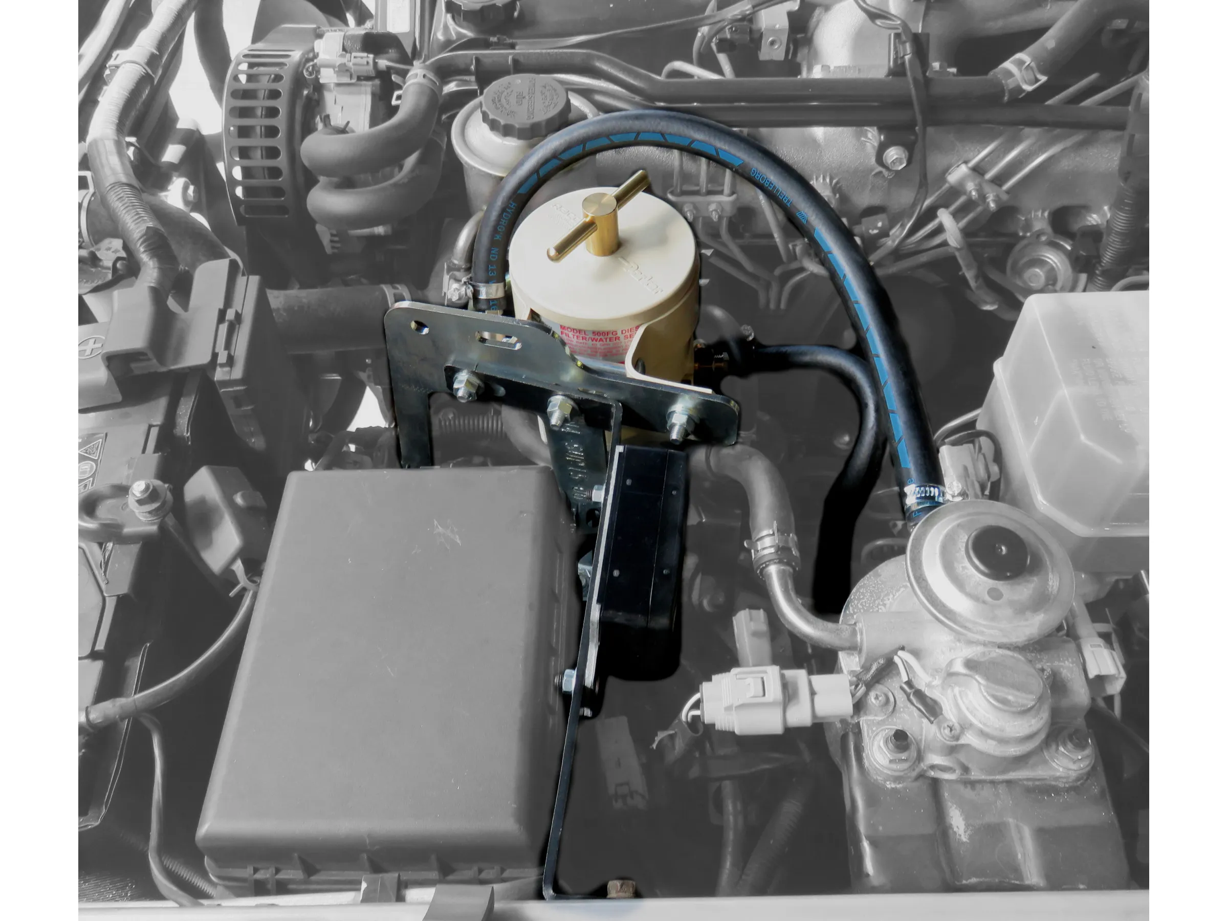 Support pour le montage d'un préfiltre à Gasoil Racor série 500FG pour Toyota HDJ100 et HZJ105 N4-Offroad Le support permet la fixation de préfiltre RACOR série 100/200/320/400/600 et SEPAR 2000 mais les raccords fournis ne sont pas adaptés. Kit complet comprenant: Support Raccords Collier Durite Nécessaire de montage Visserie Notice Le préfiltre RACOR série 500FG est vendu séparément référence : SCMO04