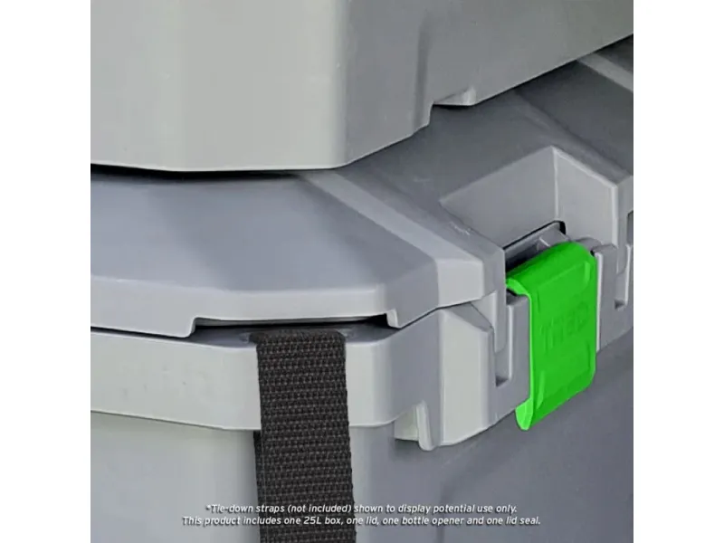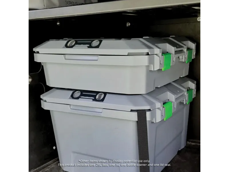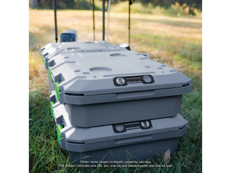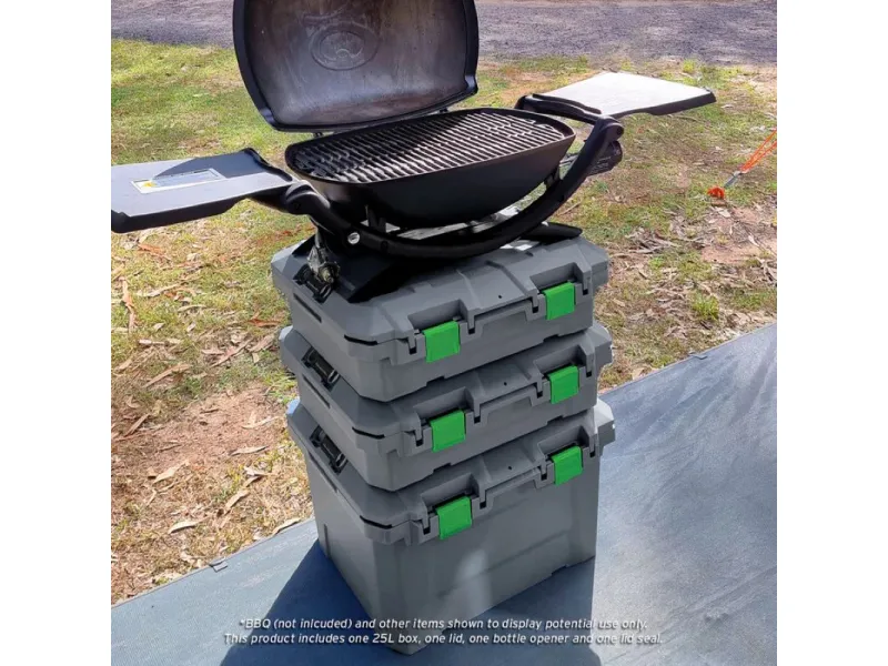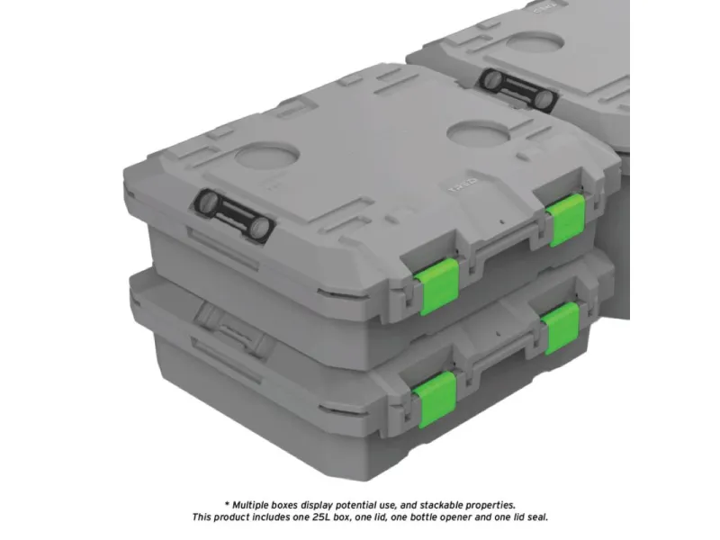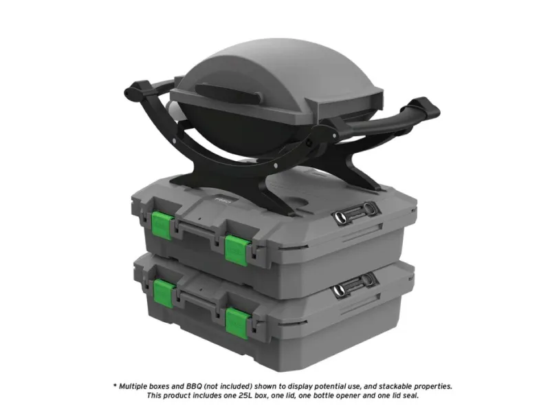 Caisse de rangement 57x51x17cm étanche anti chocs empilable La boîte de rangement TRED GT Outdoor d'une capacité de 25L a été méticuleusement conçue et ingénieusement élaborée pour garder tout votre équipement en sécurité, au sec et bien protégé. Avec son couvercle à ouverture multidirectionnelle, ses cavités pour pieds de barbecue**, son joint résistant aux intempéries, son rangement pour ouvre-bouteilles, ses bossages intégrés pour vis, ses points d'arrimage et sa connectivité TRED Link, la caisse de rangement TRED GT est parfaite pour le 4x4, le tourisme, la navigation, la pêche, le camping, l'agriculture, le rangement général à la maison et la chasse. La boîte de rangement TRED GT regorge de fonctionnalités innovantes, il ne vous reste plus qu'à fournir l'équipement et choisir la destination. Caractéristiques : Fabriquée en Australie Volume : 25L Dimensions intérieures : 525 mm (L) x 440 mm (l) x 115 mm (h) Dimensions extérieures : 575 mm (L) x 510 mm (l) x 175 mm (h) Couvercle amovible et à ouverture multidirectionnelle. Le couvercle de la boîte de rangement s'ouvre facilement de l'avant vers l'avant et se retire complètement, offrant une extrême polyvalence et un accès pratique. Joint étanche aux intempéries gardez votre équipement au sec et sans poussière. Points d'arrimage sur les 4 angles de la boite permettant l'ouverture du couvercle Fixez la base de la boîte de rangement avec des sangles de 25 mm et ouvrez toujours le couvercle pour accéder aux objets internes. Cavités intégrées pour pieds de barbecue Weber® Q Placez le barbecue Weber® Q** sur le dessus et positionnez le dans les cavités du couvercle pour une cuisson sécurisée*. Ouvre-bouteille avec rangement intégré l'ouvre-bouteille TRED-Link relie plusieurs couvercles ensemble. Conception verrouillable Sécurisez vos biens à l'intérieur de la boîte en verrouillant le couvercle et la base avec un cadenas à longue tige (cadenas non inclus). Bossages intégrés à l'intérieur de la boîte design de base empilable, empilez les bases de boîtes vides ensemble pour un rangement pratique lorsqu'elles ne sont pas utilisées. Empilez plusieurs boîtes de manière ordonnée grâce aux points d'interconnexion sur le couvercle et la base des boîtes pour un empilage sécurisé. Haute résistance et légèreté Fabriqué en polypropylène de qualité automobile, résistant aux UV, de haute résistance et léger pour résister aux conditions difficiles de l'Australie. Indicateur de mesure sur le couvercle Deux cavités porte gobelets situées dans le couvercle pour le rangement des boissons. *La durée de cuisson avec le Barbecue Weber ne doit pas dépasser 30 minutes, le bac de récupération des graisses doit être installé sur le barbecue. **Compatible avec les modèles Weber Q1000, Q1200, Q2000 et Q2200 Weber® est une marque déposée de Weber-Stephen Products LLC.