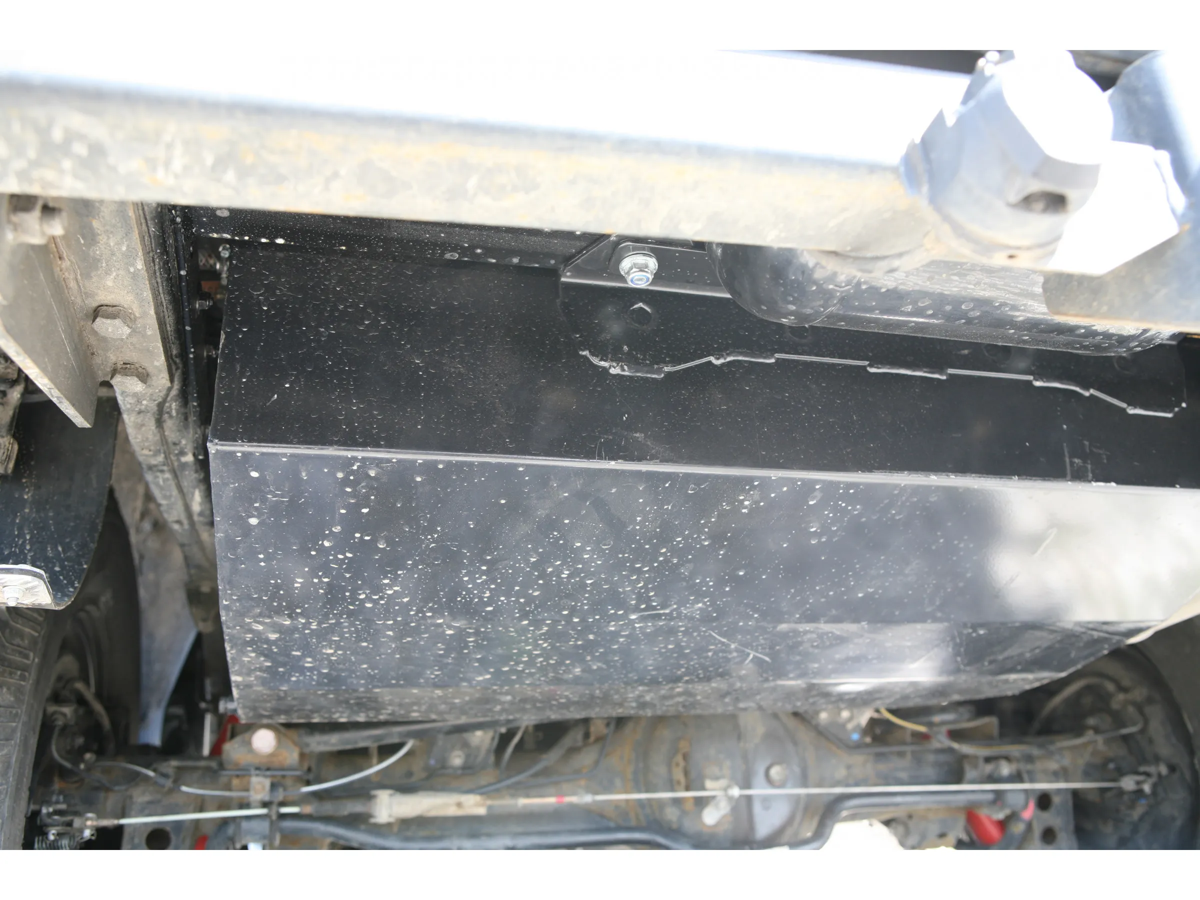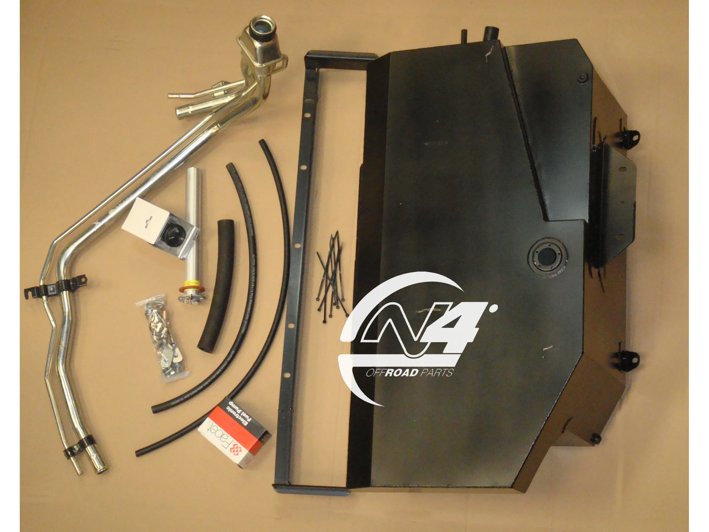 Réservoir supplémentaire de 175L pour Toyota HDJ100 N4-Offroad Vient se positionner sous le plancher AR à la place de la roue de secours. Réservoir en acier avec cloisonnement et peinture époxy. Le remplissage se fait par l'orifice d'origine avec une goulotte 2 voies d'origine Toyota. Une pompe gros débit assure le transfert de carburant du réservoir additionnel au réservoir d'origine. Montage sans modification de votre véhicule. Le kit complet comprend : Réservoir Goulotte 2 voie Pompe Facet gros débit Jauge tubulaire VDO Interrupteur Vumètre VDO Ø52 Colliers Durites Raccords Nécessaire de montage Notice Pour les baroudeurs extrêmes, un ski de protection aluminium BLRE6D est disponible en option pour protéger ce réservoir N4.