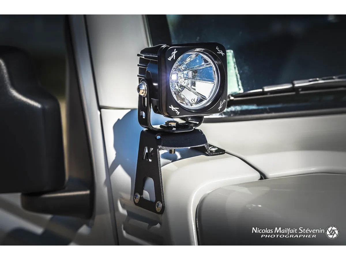 Vendu par paire. Supports de feux N4-Offroad pour des longues portées au bas du pare-brise pour le Suzuki Jimny 1.5Vvti Le montage nécessite le perçage de la carrosserie Supports en acier peint époxy noir Kit livré complet : Support droit Support gauche Visserie inox Notice Longues portées non fournis