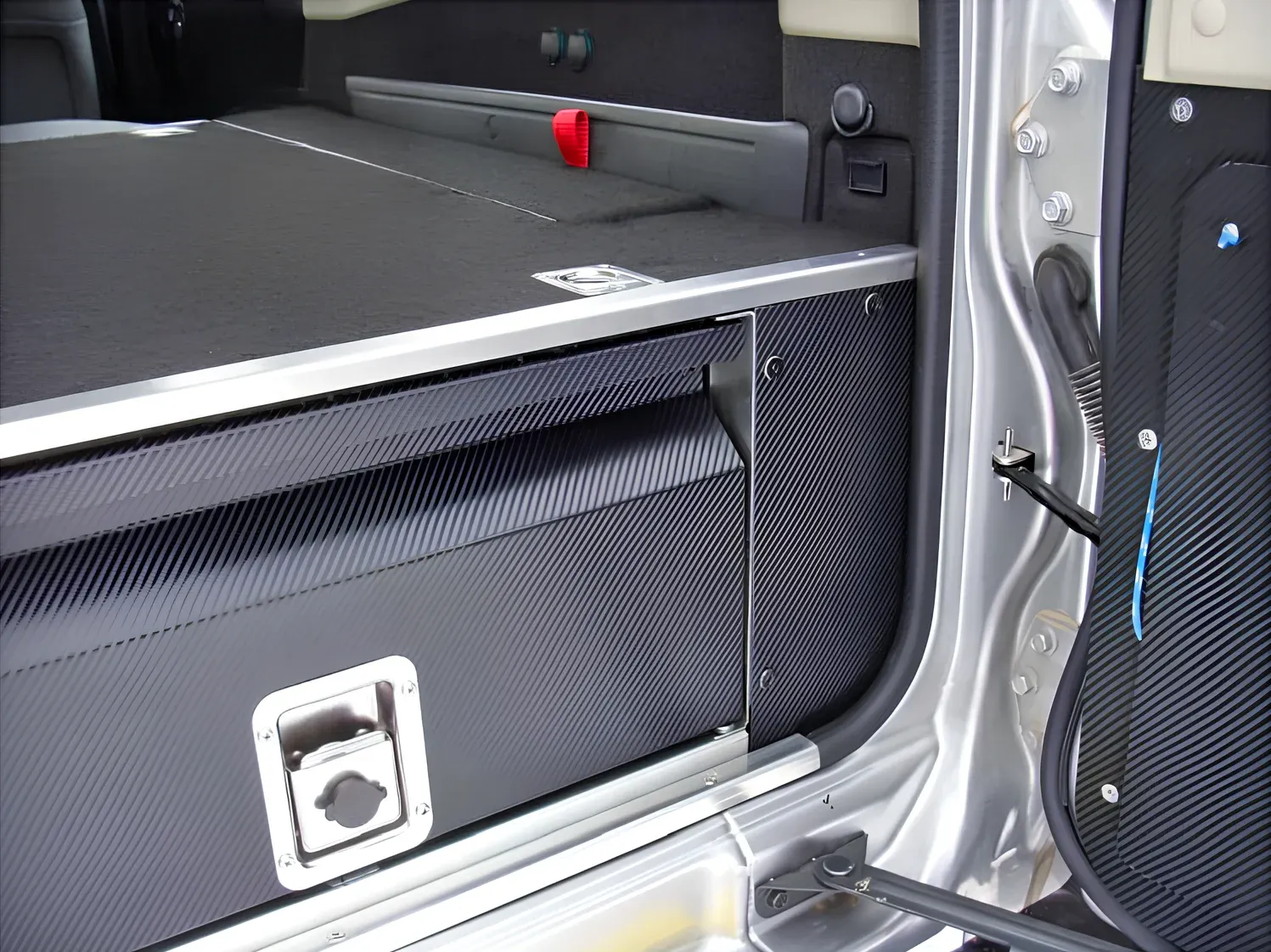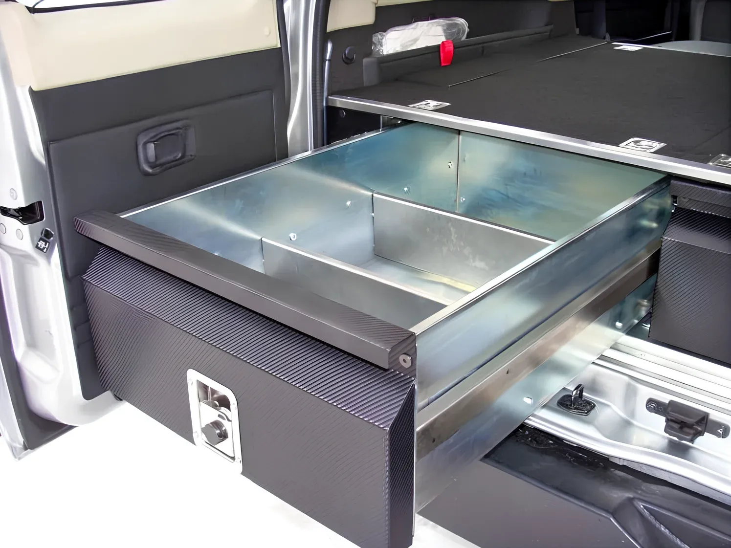Les façades sont thermolaquées en argent antique, ce qui ajoute de l'esthétique à l'ensemble. Le tiroir est équipé d'une solide serrure en acier inoxydable qui peut être verrouillée avec une clé. La partie supérieure est en contreplaqué recouvert de feutre, fixée sur les bords par un coin en aluminium, ce qui permet à l'ensemble de bien s'adapter à l'intérieur de la voiture et d'être agréable à utiliser.