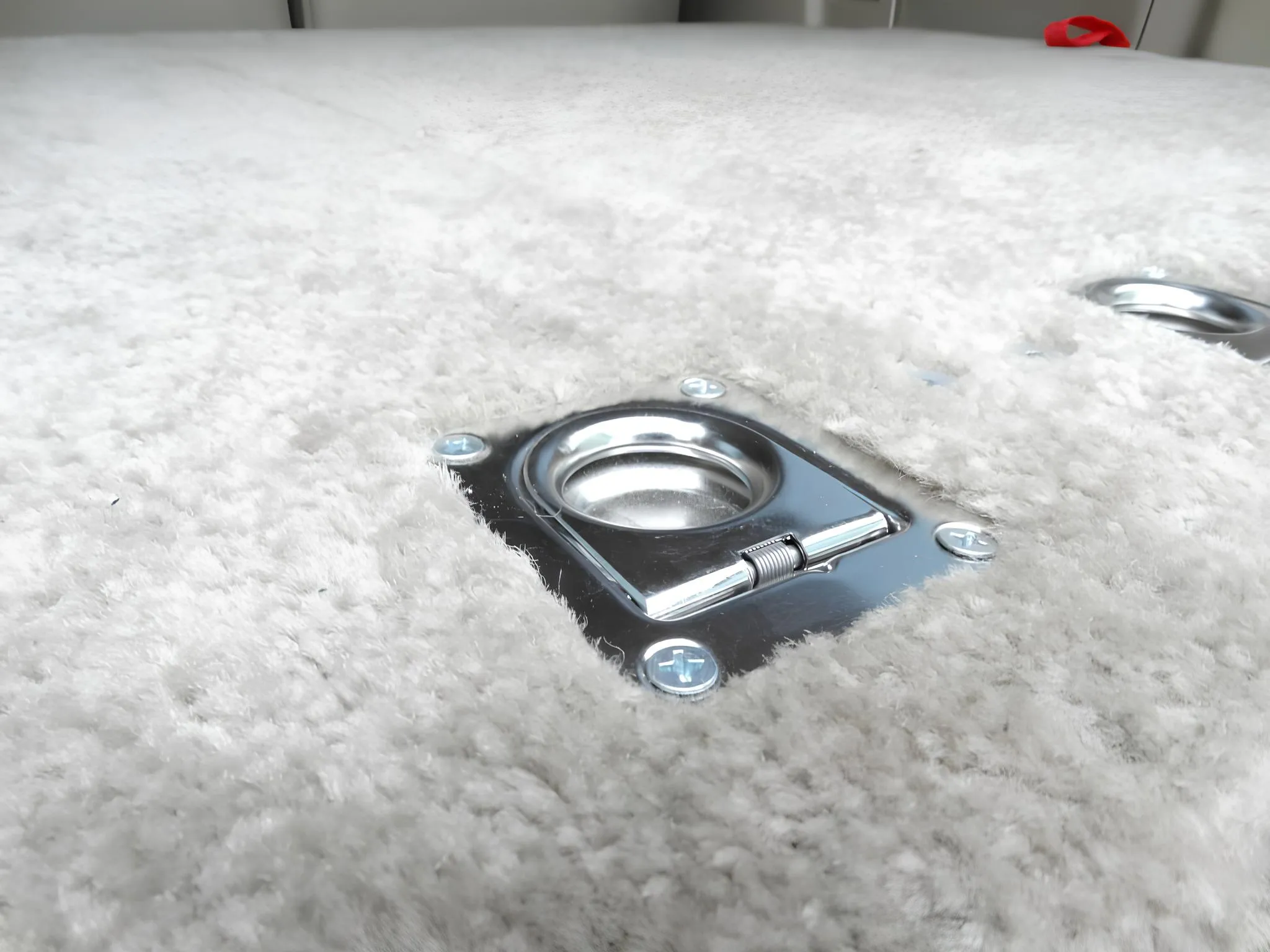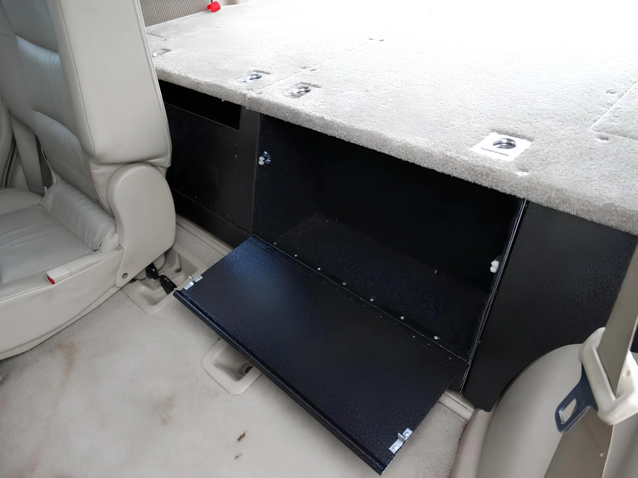 Les façades sont thermolaquées en argent antique, ce qui ajoute de l'esthétique à l'ensemble. Le tiroir est équipé d'une solide serrure en acier inoxydable qui peut être verrouillée avec une clé. La partie supérieure est en contreplaqué recouvert de feutre, fixée sur les bords par un coin en aluminium, ce qui permet à l'ensemble de bien s'adapter à l'intérieur de la voiture et d'être agréable à utiliser.